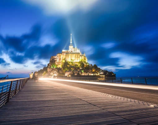 The mainland causeway offers stunning night views of the illuminated abbey. Sunset and blue hour are especially beautiful for photography.