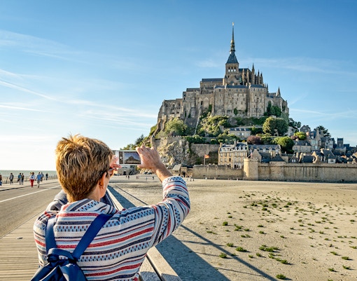 Vägen över vattnet och fastlandet bjuder på ikoniska vyer, särskilt vid soluppgång eller solnedgång. För unika vinklar kan du klättra upp på vallarna eller fotografera klostret från viken vid lågvatten.