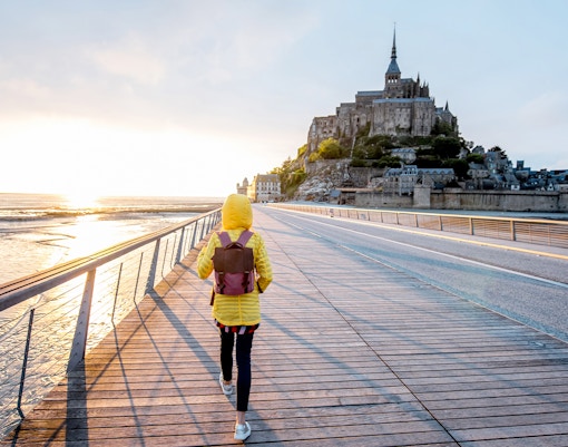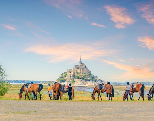 Hyr en cykel och ta dig ut på de olika cykellederna – bland annat Véloscénie och Vélomaritime – som sammanstrålar nära Mont Saint-Michel.