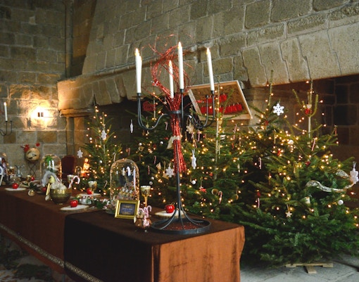 Byn och klostret är upplysta och prydda med juldekorationer, vilket skapar en magisk vinterstämning.
