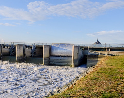 En låg damm av betong och trä vid floden Couesnon med breda trappsteg som även fungerar som utsiktsplats. Den byggdes för att hjälpa till att spola bort sand från viken och erbjuder en vykortsvacker utsikt över berget, inramat av floden.