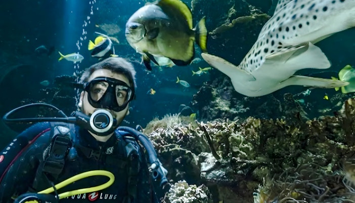 Dalgıçların devasa Elmas Tankı'na dalarak köpekbalıkları, vatozlar ve balık sürüleriyle etkileşime girmesini izleyin; böylece sualtı yaşamını yakından gözlemleyebilirsiniz.